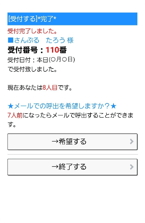 - 順番が近くなった時の「お知らせメール」がご利用できます。